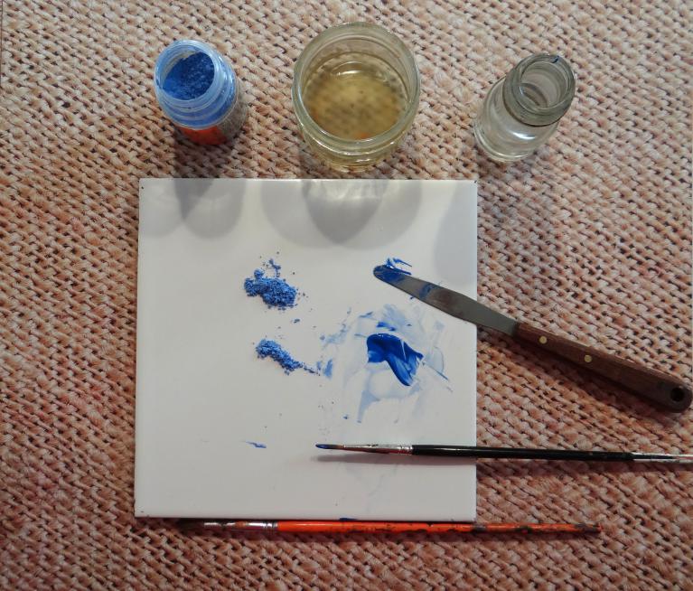 Au pinceau, avec une mousse, à la plume, comme on veut, tout est possible sur la porcelaine, pourvu que la couche de peinture ne soit pas trop épaisse ! Ce sont des pigments spécifiques que l’on mélange avec un médium (il en existe de nombreux différents) pour obtenir la peinture. Une fois posée, celle-ci est cuite dans un four dédié. Car cette peinture doit être fixée dans l’émail de la porcelaine par cuisson à 850°. La plupart du temps 2 cuissons sont nécessaires, et quelquefois plus, si le décor est plus élaboré. Une cuisson, avec un four bien rempli, c’est environ 14 heures (cuisson et refroidissement obligatoire avant d’ouvrir le four) !